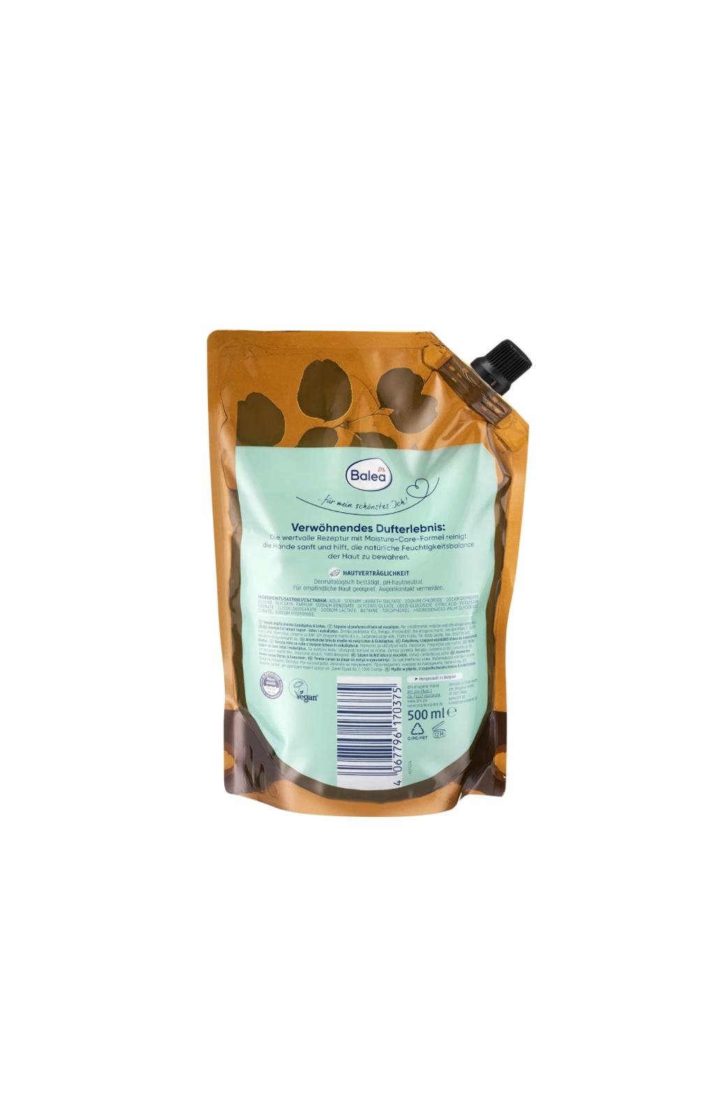 Die Flüssigseife Eukalyptus & Lotus im Nachfüllpack von Balea sorgt für ein erfrischendes Dufterlebnis bei jeder Anwendung. Mit ihrem Duft von Eukalyptus und Lotus verwöhnt sie die Sinne und bewahrt gleichzeitig die natürliche Feuchtigkeitsbalance der Haut. Die sanfte Reinigung hinterlässt ein gepflegtes Hautgefühl.